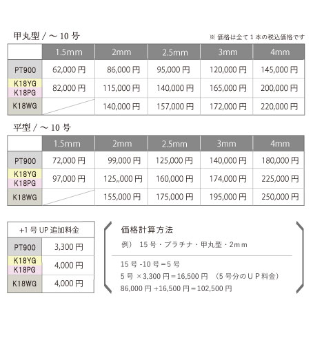 価格は『 ベースのカタチ 甲丸型 or 平打型 』『 指輪の幅 』『 指のサイズ 』『 素材 』によって決まります。